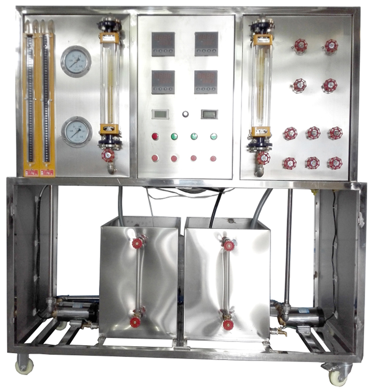 鋼原水箱及加熱水箱,順、逆流調(diào)節(jié)閥門組,阻力測試壓力表及U型差壓計,加熱功率由固體調(diào)壓模塊無級調(diào)節(jié),萬能信號輸入巡檢儀顯示溫度,電流表,電壓表,不銹鋼臺架及控制屏等。