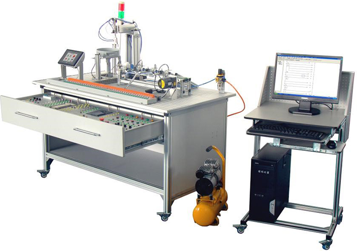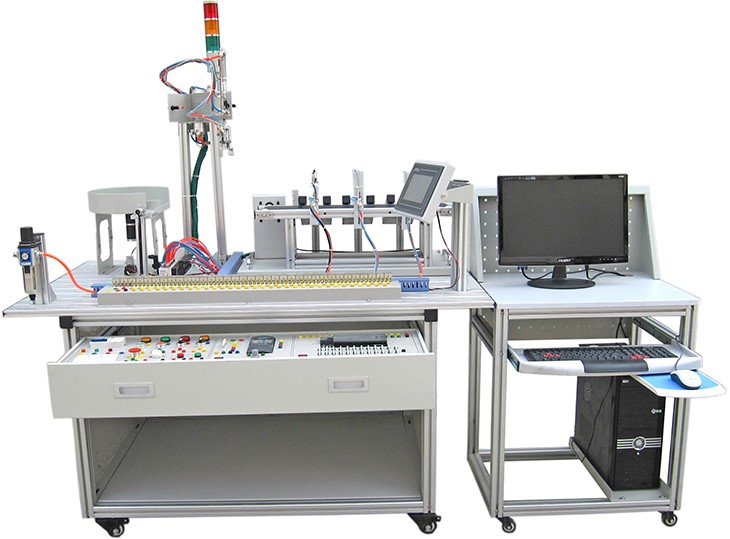 光機(jī)電氣一體化控制實(shí)訓(xùn)系統(tǒng)"是依據(jù)機(jī)電一體化教學(xué)的要求而精心研制的。它在接近工業(yè)生產(chǎn)制造現(xiàn)場(chǎng)基礎(chǔ)上又針對(duì)教學(xué)及實(shí)訓(xùn)目的進(jìn)行了專門設(shè)計(jì),強(qiáng)化了機(jī)電一體化的安裝與調(diào)試能力。實(shí)訓(xùn)裝置由型材導(dǎo)軌式實(shí)訓(xùn)臺(tái)、典型機(jī)電一體化設(shè)備機(jī)械部件、PLC